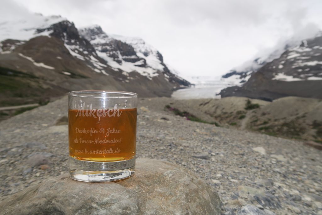 Chefe hatte mir ein nettes Abschiedsgeschenk gemacht, das die Tage würdigend zum Einsatz kam. Gefüllt mit Southern Comfort im Icefield am Athabasca Gletscher :-)