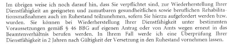 beamten im ruhestand können massnahmen zur wiederherstellung der dienstsfähigkeit auferlegt werden und entsprechend angeordnet werden. § 46 ist mit Wiederherstellung der Dienstfähigkeit überschrieben und der ganze § bezieht sich auf beamte im ruhestand de facto.