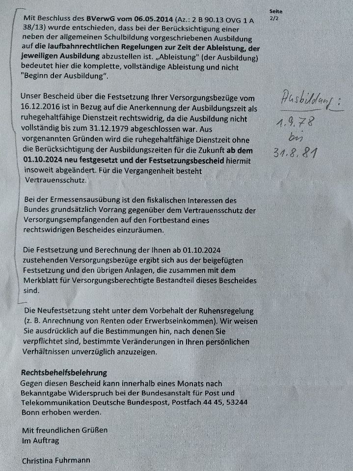 Alle Tatsachen waren der BAnstPT bereits unmittelbar nach Erlass deines Versorgungsfestsetzungsbescheides 2016 bekannt. Mit Deinem Antrag auf Anerkennung von Ausbildungszeiten vor dem 17. Lebensjahr sind der BAnstPT keine neuen Tatsachen bekannt geworden, die sie nicht bereits 2016 gewusst hätte. Deshalb dürfte die Rücknahme deines Versorgungsfestsetzungsbescheides von 2016 jetzt nicht mehr zulässig sein.