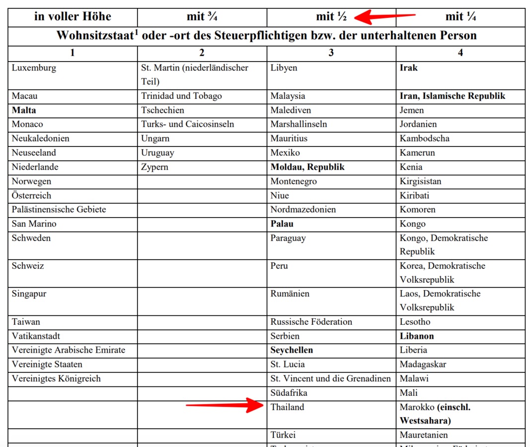 Die unbeschränkte Steuerpflicht hat (im Gegensatz zur Beschränkten) für mich den Vorteil, dass ich neben dem "vollen" Grundfreibetrag (in 2023 waren das 10.908.- Euro) und unseren Beiträgen zur Privaten (Deutschen) Krankenversicherung, Aufwendungen für den Unterhalt der nicht getrennt lebenden Ehefrau, zum Abzug bringen kann. Eine gemeinsame Veranlagung ist auf Grund der tatsächlichen Gegebenheiten (beide Wohnsitz Thailand) in unserem Fall rechtlich nicht möglich. Generell wäre die Absetzung des Unterhalts ebenfalls bis zur Höhe des Grundfreibetrages möglich. Doch im Gegensatz zum eigenen Grundfreibetrag, ist dieser für Thailand nach der Ländergruppeneinteilung des Bundesfinanzministeriums zu kürzen.