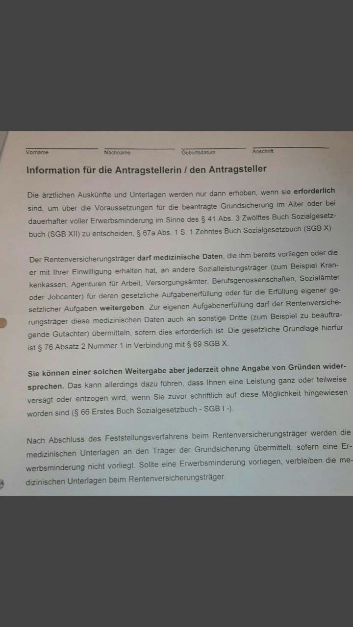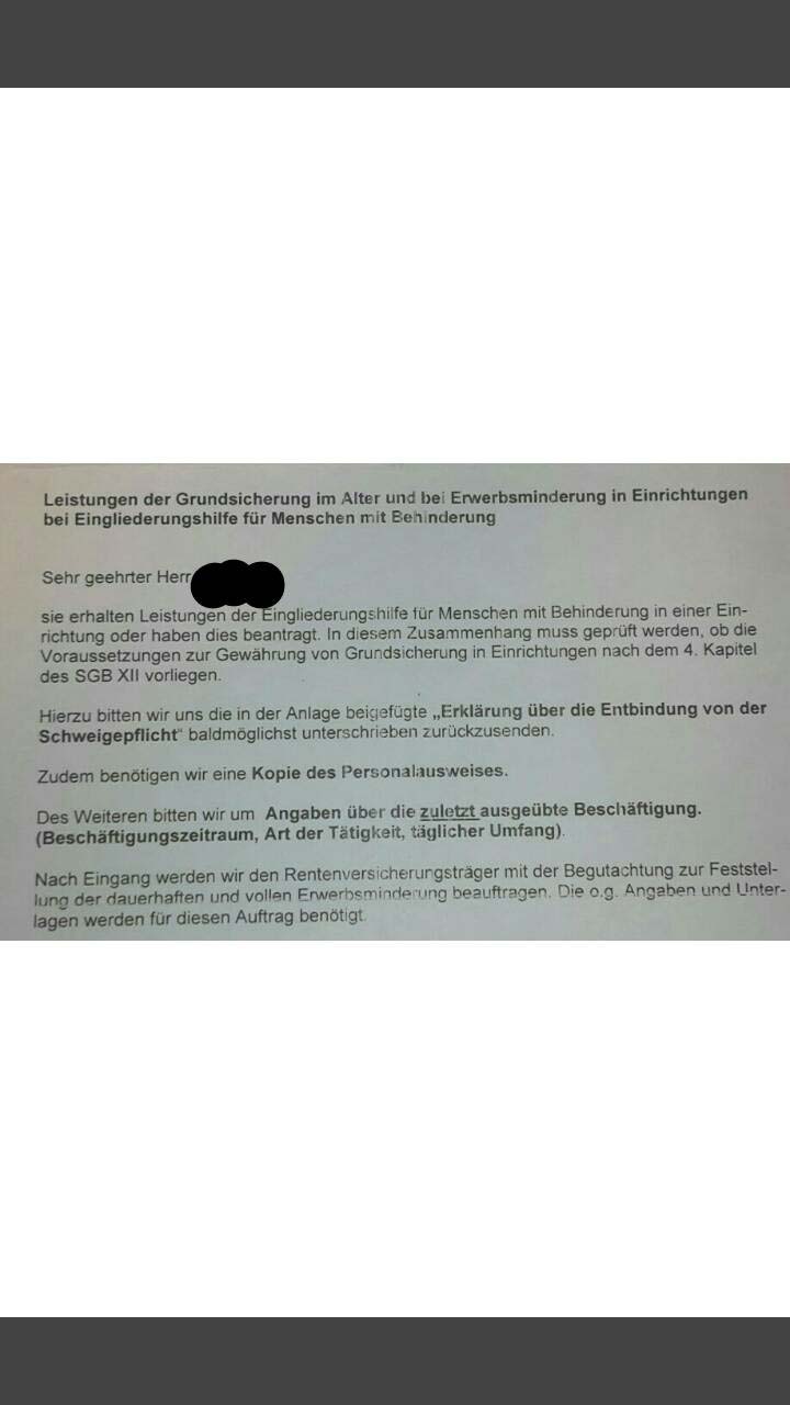 Das war Oktober 2018. Baden-Württemberg. Das Sozialamt hat mir folgende Dokumente geschickt (siehe Anhang). Die meinten ich muss das ausfüllen. Kann auch gerne den Rentenversicherungsbescheid schicken sobald der mir vorliegt.
