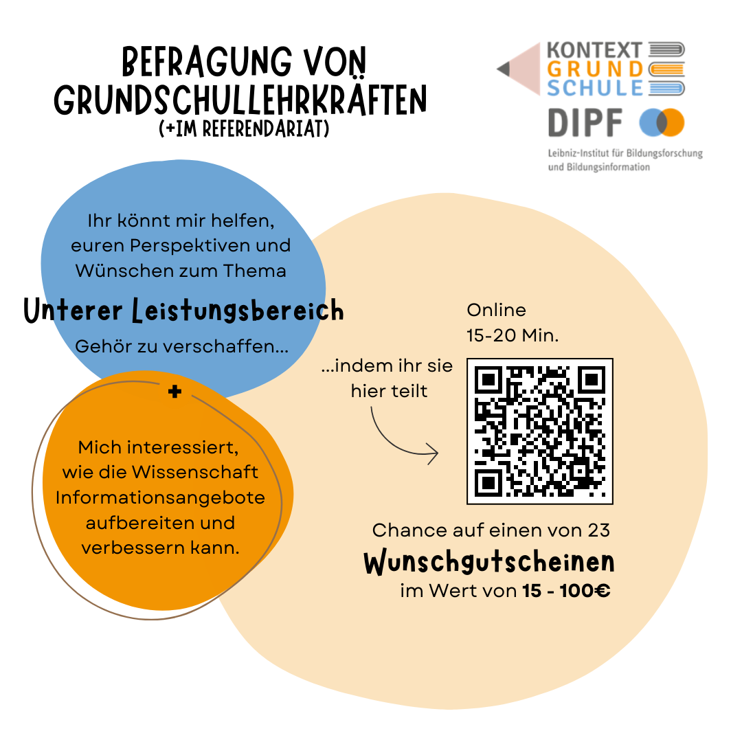 wir sind an euren Perspektiven zum unteren Leistungsbereich interessiert! Auch hören wir gerne, wie ein passendes digitales Informationsangebot von Wissenschaftler*innen für Grundschullehrkräfte gestaltet sein sollte und welche Inhalte ihr darin mehrwertbringend fänden.