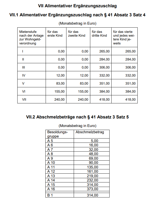 A7, 2 Kinder, Mietenstufe IV(z.B. Berlin): Grundgehalt + FZ Stufe 2 + 12 (1. kind) + 12 (2. Kind) - 32 (Abschmelzbetrag) = Bleibt bei Grundgehalt + FZ Stufe 2, da der Abschmelzbetrag größer ist, als der kumulierte Ergänzungszuschlag.